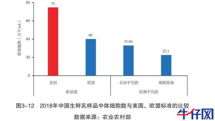2018年,全國生鮮乳制品體細胞數監測數據的平均值33.04萬個/毫升,顯著低于美國75萬個/毫升和歐盟40萬個/毫升的標準。