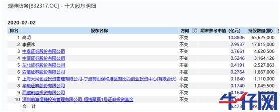 資料顯示,中泰證券(行情600918,診股)持有觀典防務462.05萬股,中信證券(行情600030,診股)和東北證券(行情000686,診股)則分別持有316.41萬股和252.79萬股。