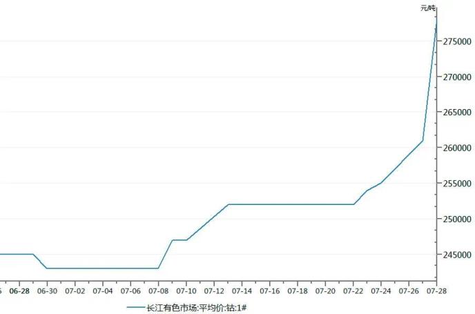 長(zhǎng)江有色金屬網(wǎng)數(shù)據(jù)顯示,金屬鈷7月28日現(xiàn)貨報(bào)價(jià)為27.8萬(wàn)元/噸,較前一日上調(diào)1.7萬(wàn)元/噸。目前,金屬鈷的報(bào)價(jià)已較月初上漲逾14.4%。
