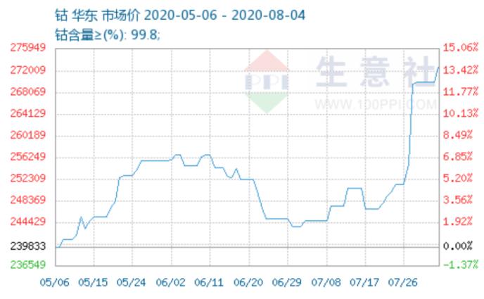 進入7月下旬鈷價快速回升,引起市場關注,而且在鈷價沖擊30萬元/噸關口之時,有機構相繼喊出鈷價有望大幅上漲,沖擊40萬元/噸高位。在消息刺激下,8月4日相關鈷概念股錄得大漲。