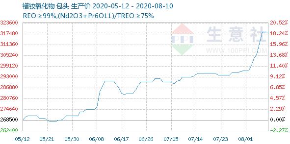據生意社數據,8月10日國內輕稀土市場價格上漲,金屬鐠釹價格上漲4000元/噸至40.25萬元/噸,鐠釹氧化物價格上漲1500元/噸至32萬元/噸,氧化釹價格上漲3000元/噸至33.95萬元/噸,金屬釹價格上漲7000元/噸至42.45萬元/噸,氧化鐠價格上漲1000元/噸至30.1萬元/噸。