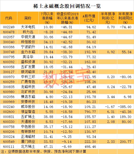 據統計,與2019年以來高點相比,大洋電機(行情002249,診股)、科力遠(行情600478,診股)、中鋼天源、科恒股份、寧波韻升(行情600366,診股)等5股累計回調40%以上,其中大洋電機累計回調46.31%居首。正海磁材(行情300224,診股)、廈門鎢業、北方稀土表現較為堅挺,回調幅度均在10%以內。