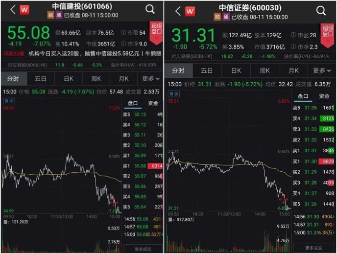 其中,前一日受與中信證券合并傳聞?dòng)绊懘鬂q逾8%的中信建投大跌逾7%,前一日上漲近4%的中信證券今日下跌近6%。