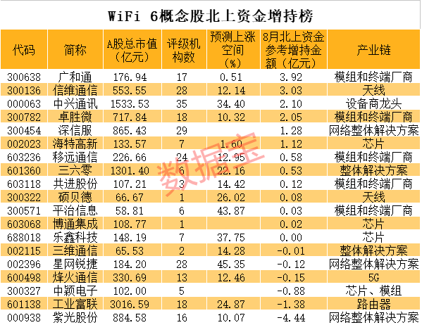 證券時報·數據寶不完全統計顯示,A股上市公司中WiFi 6相關概念股有33家以上,A股市值合計超1.1萬億,3股市值超千億,分別是工業富聯、中興通訊、三六零。工業富聯與產業鏈相關產品有路由器,中興通訊是設備商龍頭,三六零屬于整體解決方案商。芯片相關公司包括樂鑫科技、博通集成、海特高新等,模組和終端廠商有卓勝微、移遠通信、共進股份等。