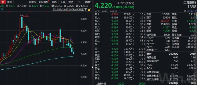 港股銀行板塊表現更差。9月2日,工商銀行(行情601398,診股)港股收于4.22港元/股,創三年來新低,同樣創三年新低或逼近三年來新低的還有中國銀行(行情601988,診股)、建設銀行(行情601939,診股)和農業銀行(行情601288,診股)。