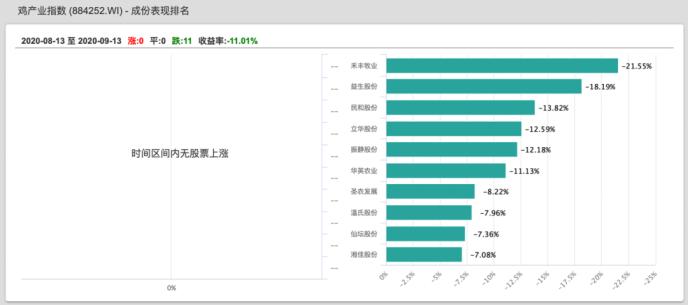 Wind數據顯示,雞產業指數上周(9月7日-9月11日)累計下跌9.33%,本月累計下跌12.12%,年初至今跌逾10%。