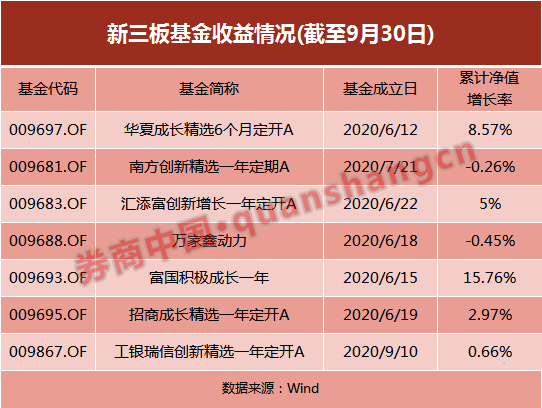 從新三板基金的收益看,自6月12日首只可投新三板基金成立以來,截至目前共發(fā)行成立7只可投新三板的公募基金。截至9月30日,這些基金的業(yè)績出現(xiàn)分化,平均收益率4.6%,最高一只收益超過15%,同時有兩只基金收益非正,凈值出現(xiàn)了小幅下跌。