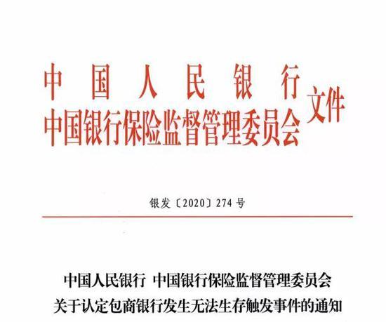 根據(jù)該《通知》,2019年5月24日,中國人民銀行、中國銀保監(jiān)會(huì)對包商銀行實(shí)施接管。《通知》稱,在接管期間,經(jīng)清產(chǎn)核資,確認(rèn)包商銀行已嚴(yán)重資不抵債,無法生存。根據(jù)《商業(yè)銀行資本管理辦法(試行)》等規(guī)定,中國人民銀行和中國銀保監(jiān)會(huì)認(rèn)定包商銀行發(fā)生“無法生存觸發(fā)事件”。