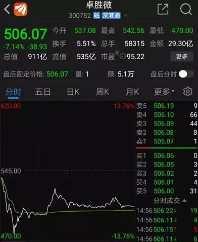 國內射頻芯片龍頭卓勝微今日出現大幅波動,尾盤收跌7.14%。今日該股盤中一度跌超13%,最新股價506.07元。卓勝微是目前芯片概念股中股價最高的個股,在全部A股也能排名第四,是名副其實的“芯片概念股股王”。