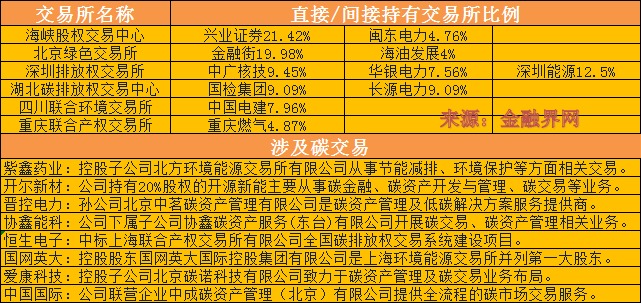 另外,國網英大(行情600517,診股)控股股東國網英大國際控股集團有限公司是上海環境(行情601200,診股)能源交易所并列第一大股東,國網英大子公司置信碳資產管理公司是國網公司系統內唯一一家專業從事碳資產經營業務的公司。恒生電子(行情600570,診股)此前中標上海聯合產權交易所有限公司全國碳排放權交易系統建設項目。紫鑫藥業(行情002118,診股)、開爾新材(行情300234,診股)、晉控電力(行情000767,診股)、協鑫能科(行情002015,診股)等上市公司的下屬公司相關業務涉及碳交易。